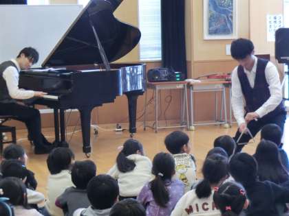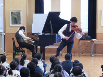 エバリーの皆様が学校を訪問し、ミニコンサートを開いてくださいました。聴くだけでなく、体を動かしたり、楽器体験をしたりしながら実施する体験型コンサートをコンセプトにしているそうです。1・2年生が参加しました。音楽の楽しさを心から味わうことができました。楽器の音色の豊かさに触れることができました。子どもたちから大きな拍手がおくられました。
