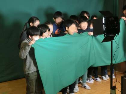 授業の最後に、CGについてお話していただきました。現在、ドラマなどでは、CGが取り入れられ、ドラマの世界を豊かに創り出しているそうです。子どもたちも感心しながらお話を聞いていました。CGが完成するまでには1か月ほどかかることがあることや、物事をしっかり見つめることの大切さなどを教えていただきました。子どもたちも緑の布を活用して、別世界に移動する体験をさせていただきました。崖の上に立ち、雄大な海を見つけるシーンや、温泉にのんびり入るシーンに、瞬間的に移動する子どもたち。映像を見ながらみんなで楽しむことができました。体験を通して学ぶ、報道の世界・・・貴重な学びの時間になりました。