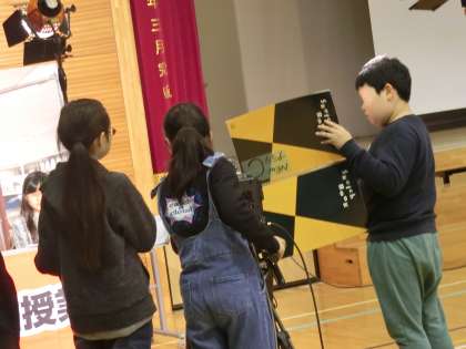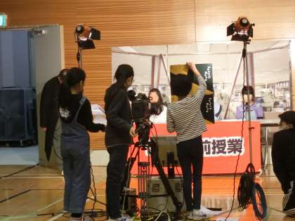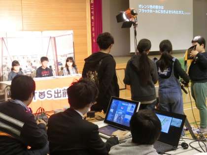ニュースキャスターやアナウンサーが伝える様子を撮るカメラマンも子どもたちが担当しました。カンペを出すフロアーADや画面を切り替える担当など、様々なことを体験しました。こんなふうに多くの人の協力とチームワークで報道番組が作られていることを実感できました。