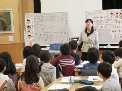 グループごとに、たけのこの分け方が違うことに気が付きました。数や量による公平、畑の所有者であるおじいさんを意識した公平、たけのこ料理を作りみんなで食べるという新しいアイディアを生み出すことで実現する公平、立場や努力を加味した公平・・・たくさんの公平な分け方が発表されました。この子どもたちの話し合いを受け、弁護士の坂本順子先生は次のように授業をまとめました。「グループごとに考え方が違っていたように、人にはそれぞれの考え方がある。考え方の違いをお互いに知って、人の意見を聞くことが大切」「そして・・・意見に対して意見を述べることがとても大切」「互いの意見を交換し合って出した結論はみんなが納得がいく。」「友達の思いや考えを聞いたり想像したりして、互いの意見を伝え合い、様々な問題を解決しながらいいクラスにしていきましょう」と。とても大切なことを学んだ1時間になりました。