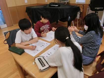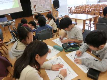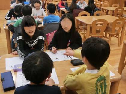 弁護士の坂本順子先生から課題が出されました。3人の子どもたちが登場し、たけのこを収穫しました。「公平」に分けるためにはどうしたらよいかを考える課題です。3人の子どもたちにはそれぞれ違う立場や考え方があります。4年生の子どもたちは、さっそくグループごとにたくさんの意見を交わし合いました。