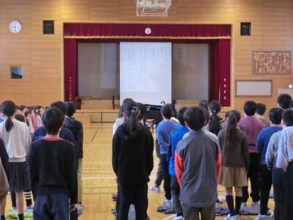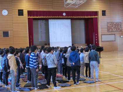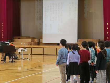 2月の音楽朝会を行いました。今月は「ひまわりの約束」の歌を歌いました。この歌は、6年生を送る会で全校の子どもたちが、お世話になった6年生に感謝の気持ちを届けるために歌う歌です。これまでお世話になった6年生のことを思いながら、みんなで一生懸命に練習しました。みんなとてもいい歌声です。もう一つ、5年生の音楽鑑賞教室について、音楽の教員から話がありました。5年生がとてもすばらしい態度で鑑賞教室に臨んでいたことへの称賛の言葉です。音楽を聴く態度、トイレの水回りをきれいにしようとする心づかい、拍手や歌声のすばらしさ・・・4月から6年生になる5年生がほんとうによくがんばりました。