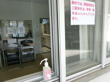 各受付にはアルコール消毒を置かせていただきました。よろしければお使いください。また、ソーシャル・ディスタンスを確保できるように、テープを貼りましたので目印にしていただきますようお願いいたします。保護者の皆様には多大なるご協力をいただいておりますことに感謝申し上げます。