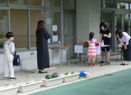 5月12日、1・3・6年生の課題受け渡し日です。午前中は1年生。保護者の皆様のご協力もいただき、受け渡しがはじまりました。