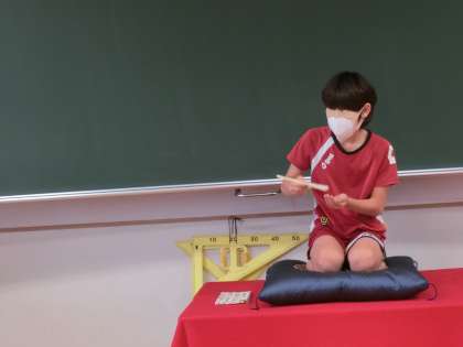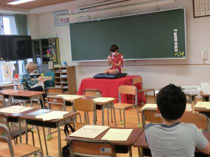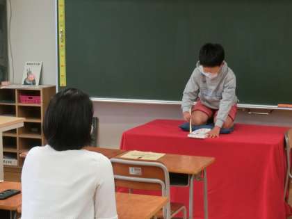5年生の今日の15分間授業の後半は「古典芸能の世界」の中でも落語についての課題発表会です。子供たちが考えた「落語のしぐさ」を特製ステージの上で披露しました。「熱いそばを食べる」「バナナを食べる」「戸をたたく」「俳句を書く」など・・・子供たちなりの世界でいっぱいになりました。一生懸命にがんばっていました。今日は2名の友達と先生との交流ですが、学校が再開した時には、多くの友達のがんばりを認め合っていきたいと思います。