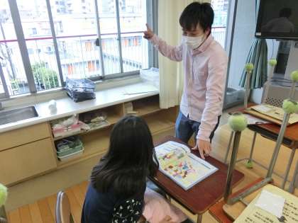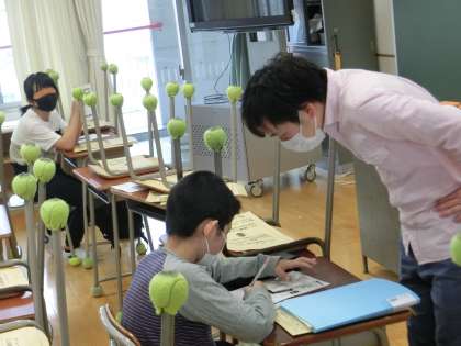 最上学年になった6年生の課題受け渡し日の様子です。1週間の課題を話題にしながら担任と交流しました。外国語活動の課題を振り返る場面もありました。