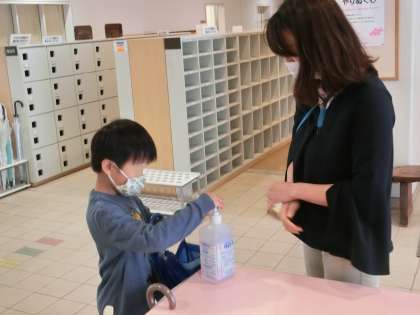 5月18日と19日は、駒沢小学校の課題受け渡し日です。正面の玄関で手指の消毒をお願いしました。おうちで検温をしていない子は学校で体温を測ります。みんなの協力でスムーズに課題受け渡しが進んでいます。