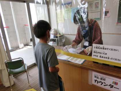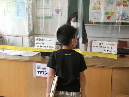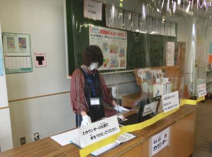 2冊の本を選んだ子供たちは、カウンターで学校図書館司書の方に本の貸し出しをしていただきました。カウンターにはビニルシートを取り付けて感染予防対策を施しました。