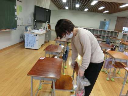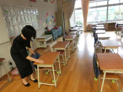 子供たちが安心して登校できるよう、特に、机といすは念入りに消毒しました。