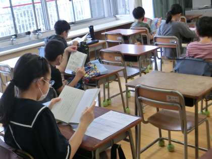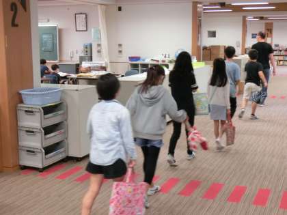 4年生は、学校に登校しない日に家庭で読書できるように、学校図書館で本の貸し出しを行いました。学校図書館に移動するときも、間をあけて行動します。学校図書館が密にならないように時間を区切って本を借りに行きました。友達が戻ってくるまで、借りた本を読んで過ごす子供たち。熱心に本を読む姿があちらこちらで見られました。