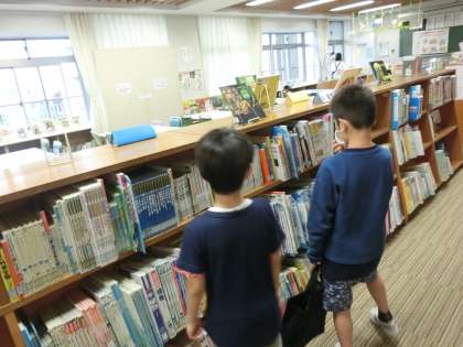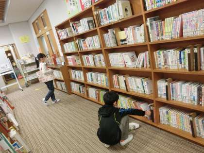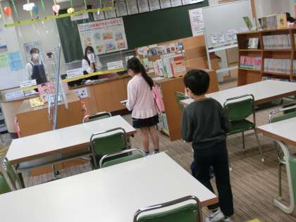 3年生も学校図書館を活用しました。できるだけ、間隔をあけて並びます。子供たちもとてもしっかり行動できています。