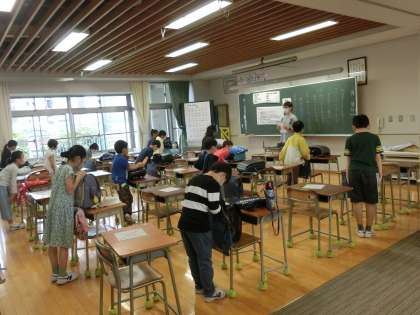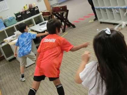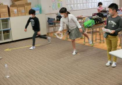 学習の合間に、楽しく体を動かすことができるようにと、新聞紙で作った輪をペットボトルに向かって投げました。新聞紙の輪っかはとても軽くて、なかなかペットボトルに的中しません。みんなで何度も挑戦し、楽しみにながら体を動かしました。3時間の授業が終わると、「また来週までお元気で!」とさよならのあいさつを交わしました。3年生、みんなよくがんばりました。