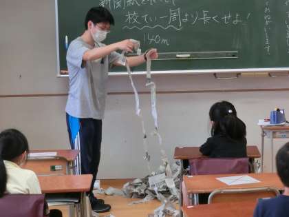 「140mまであと少し残っている。もう少しなのに・・・」と悔しがっていると、担任が「先生もこのクラスの一員だよ。実は、先生も用意をしてきたんだ。」と長くちぎった新聞を取り出しました。みんなで距離を確認していきます。なんと、140mを超えることができました。先生と子供たちは大喜びです。思わず拍手が飛び交いました。先生から「みんなで力をわせればきっとできる! これからも力をお合わせていこう。」と、メッセージがおくられました。