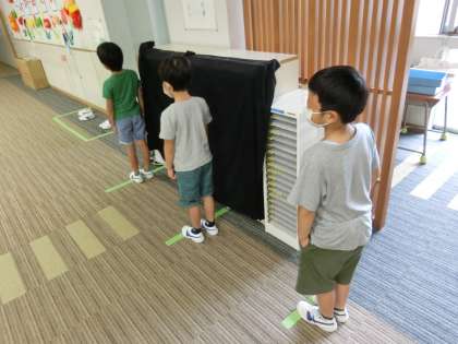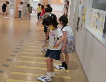 国語や算数の学習のほかにも、学校生活を気持ちよく送るための約束を確認しました。みんな先生のお話をとてもしっかり聞くことができるので、学校の約束もすぐに理解し、約束を守りながら行動できるようになりました。トイレを待つときや教室から移動するときは「密」にならないよう間隔をあけること、上履きを脱ぎはきするときは、広い場所で行うことなどです。立派な1年生です。