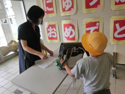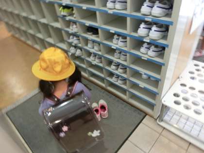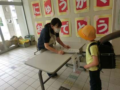 6月2日、段階的な教育活動の再開、分散登校第1週の2日目です。今日の登校学年は、1・5・6年生です。1年生は、課題受け渡しの15分を経験しているとはいえ、靴箱を使って教室に入り、15人のお友達と初めて授業を行います。これまでの15分から3時間に・・・今日1日とてもがんばりました。靴箱も外靴と上履きを置く場所が異なるので、その流れを覚えるのも大変です。あせらず、ゆっくり学校生活に慣れてほしいと思います。6月2日の分散登校・・・今日は1年生を中心に子供たちの様子をご紹介します。写真は登校時、体温の報告をしている様子です。