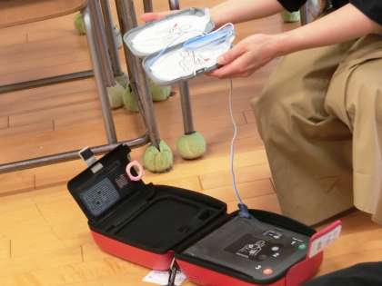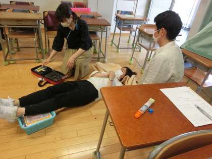 AEDを使う場面をシミュレーションして、使い方の確認をもう一度行いました。今回の研修では、「感染症対策」「嘔吐対応」「食物アレルギー対応」などについて話し合いを深めました。また、様々な場面を想定して教職員の動きを確認しました。子供たちの安全を守るための大切な研修と受け止め、教職員一同、真剣に研修会に臨みました。