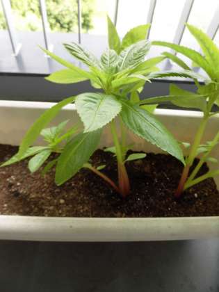 今日は天気もよく、人も植物ものびのびと過ごせる一日です。学校で育てているホウセンカもすくすくと成長し、よく育っているものは、背が20cmほどまで高くなりました。(写真1枚目)