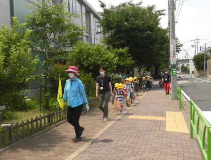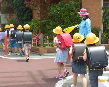 分散登校第2週目の1年生の下校は先週同様、コース別集団下校です。多くの教職員が子供たちの安全指導にあたります。地域の皆様からなる「小1サポーター」の皆様がこの日も1年生をあたたかく見守りました。学校主事も横断歩道など、子供たちの安全誘導をていねい行います。みんな上手に下校できました。