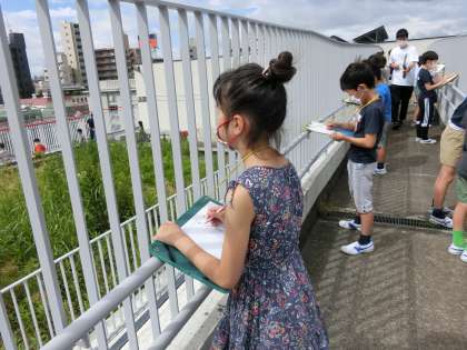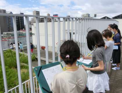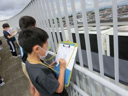 分散登校第2週目の3年生の様子です。屋上から見ることのできる建物や自然の様子を観察しました。先生のお話をしっかり聞いて、みんな真剣に学習に臨んでいます。立派な3年生をうれしく思いました。
