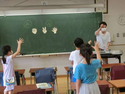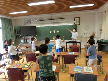 2年生の音楽の授業の様子です。この日は10分だけ、音楽の先生と授業をしました。今年度は2年生も音楽の先生の指導を受けます。大きな声で歌を歌うことはまだできませんが、先生の弾くオルガンに合わせてじゃんけんをしたり、体いっぱい使ってリズムを刻んだり、子供たちがいつのまにか笑顔いっぱいになりました。