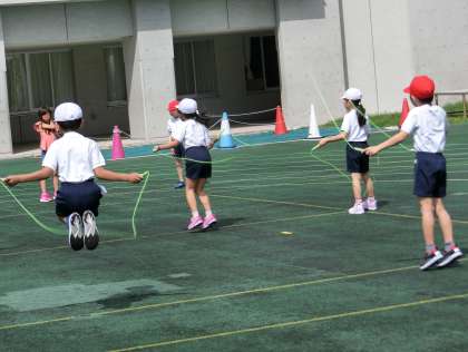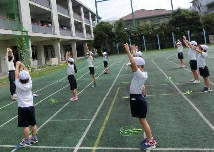 分散登校第3週目の2年生は、体育着に着替えて体育の授業を行いました。体育の授業では、ペアや小グループで身体接触や近距離での発声を伴う活動を避けながら、体を動かしました。久しぶりの体育、みんな生き生きとしていました。準備運動も距離を保つことを意識しました。縄跳びにも挑戦しました。
