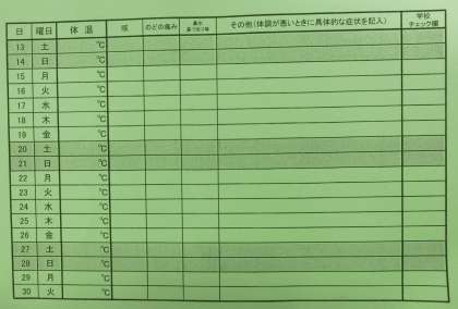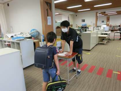 6月15日、分散登校第3週目が始まりました。今週は、1・2年生は3日間の登校、3年生以上は毎日の登校です。午前と午後のグループ別登校は今週もまだ続くため、クラスの全員がそろうことはできませんが、学校に登校する日が増え、子供たちの学校生活も少しずつ日常を取り戻しはじめました。今日6月22日は全校児童が登校するため、昇降口が密にならないように、健康チェック表による体調の聞き取りは、学級前のオープンスペースで行うことにしました。健康チェック表も裏面に入りました。引き続きの検温と記録をお願いします。また、マスクの着用とマスク入れの準備につきましてもご協力をいただいています。ありがとうございます。
