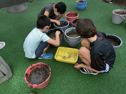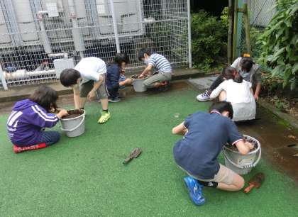 5年生がお米作りに挑戦することになりました。種を水につけ、教室で発芽を待ちました。今日は、苗を土に植える活動をしました。みんな真剣です。心を込めて小さな小さな苗を植えていました。