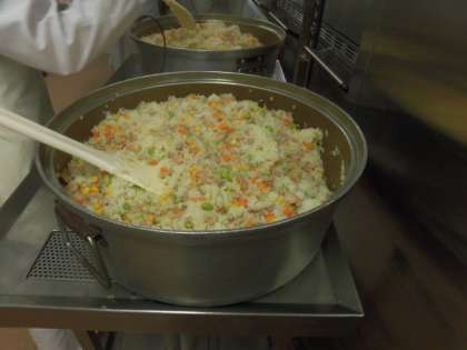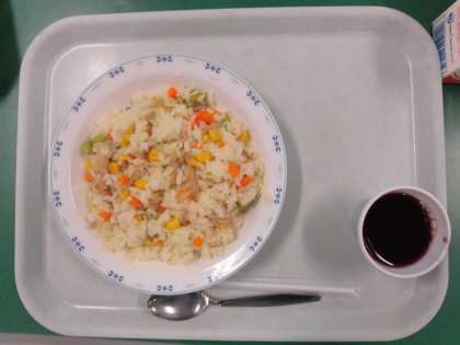 今週も品数が少ない献立になります。今日のごはんは3色ピラフ、にんじん・コーン・えだ豆の3色がきれいなピラフです。野菜多めのピラフの具をしっかりバターライスに混ぜています。