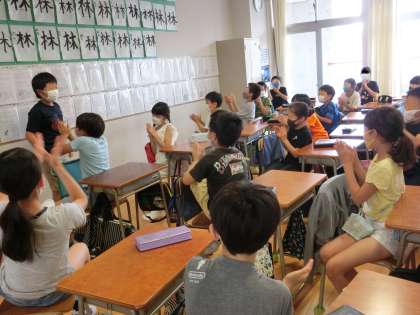 休校中に子供たちが一生懸命に考えたクラスのマスコットキャラクター。マスコットには様々な思いが込められています。4年生はクラスのマスコットを決めるために、自分で考えたマスコットをクラスの友達に紹介しました。発表が終わると、友達から拍手が起こります。お互いの思いや考えは違うけれど、互いに認め合う4年生の姿がとてもすてきでした。