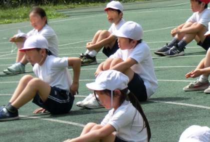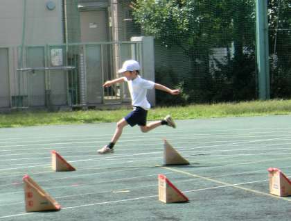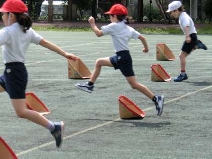 2年生の体育の様子です。体育の学習では、今、感染症拡大予防と熱中症予防に取り組みながら、子供たちにとって楽しい活動、子供たちの体力向上を意識した活動を行っています。この日の学習はリレーです。2年生の子供たちも楽しめるように、段ボールで作った障害物を置いたり、コーンを回ったりしました。体育ずわりもとっても上手です。水分補給、手洗いも忘れずに行うことができました。