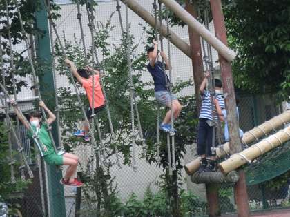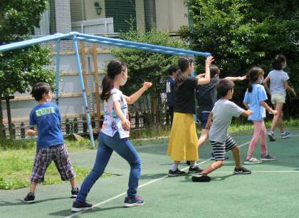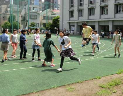 子供たちの大好きな休み時間の様子です。子供たちの工夫がいっぱいです。休み時間は「3密」を回避するために、校庭・体育館・屋上に分かれて過ごします。また、休み時間は子供たちの運動量が増えることから、基本的にはマスクを外して活動しますが、教室に入る前に、手洗い指導を徹底することで感染防止に努めています。子供たちもしっかり手洗いしています。校庭では、一番人気のアスレチックをはじめ、タッチなしの「だるまさんがころんだ」や、手をつながない「はないちもんめ」など、友達と触れないようにしながら遊ぶ子供たちの様子が見られます。子供たちは思い思いの休み時間を楽しんでいます。