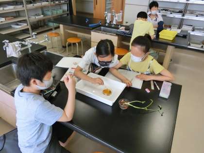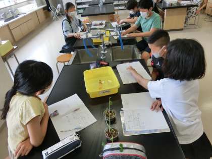 5年生が理科室で実験を行っていました。インゲンマメの子葉に養分が含まれているかどうかを確かめる実験です。静かに落ち着いて実験に臨む5年生に高学年の仲間入りをしたた立派な姿を見ることができました。ノートもていねいにとっています。この日は、理科実験グループと図工グループに分かれて学習を進めました。