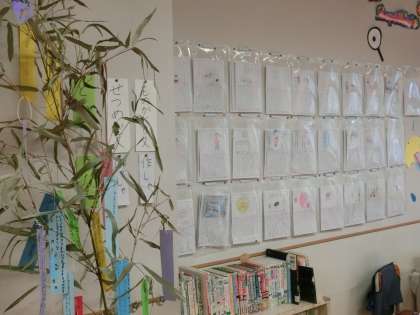 まだまだ、たくさんのその子らしい願い事が笹の葉に飾られています。みんなすてきな願い事ばかりです。願いに向かって、一生懸命に努力したり挑戦したりすることは、とても大切なことですし、とてもすばらしいことです。子供たちの願いがかなうようにこれからも応援していきたいと思います。