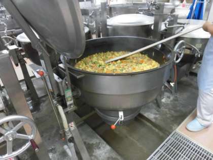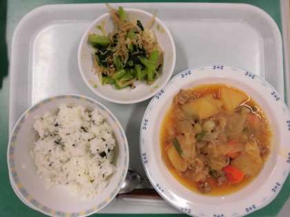 今日は定番の1品、肉じゃがうま煮です。給食室では玉ねぎの甘みと食感の2つの味を出すために、2回に分けて玉ねぎを加熱しています。給食室で取ったかつおだしで煮込み、しっかり味がしみ込んでいます。