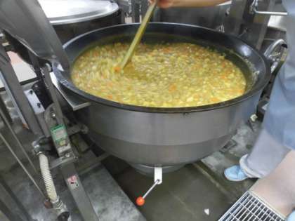 今日の献立は定番の人気献立カレーライスです。給食室で小麦粉・バター・油・カレー粉をゆっくり炒めてルーをつくっています。カレーの中にはりんごのすりおろしやはちみつなどが入り、深みがあるおいしいカレーに仕上げています。