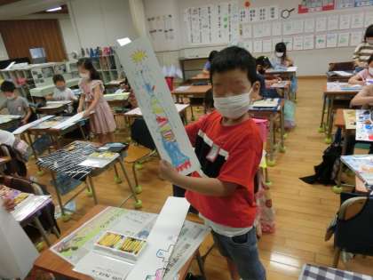 心を込めてつくりあげた作品を、うれしそうに見せてくれました。子供たちのアイディアの豊かさにも感心しました。
