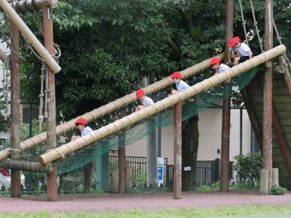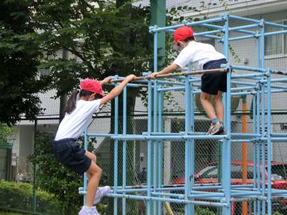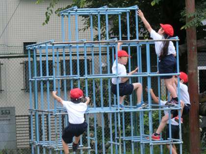 アスレチックにも挑戦。次はジャングルジムです。一番上のバーをタッチします。子供たちの夢中になって取り組む姿が見られました。