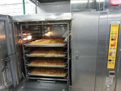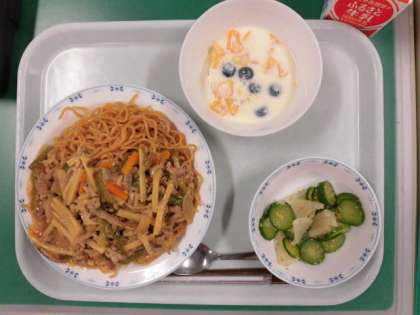今日は今年度初めての麺献立です。今日はチンジャオロースを焼きそばにかけたチンジャオ焼きそばです。千切りの野菜・豚肉を炒めてオイスターソースなどで甘辛い味付けにしました。中華めんはオーブンで蒸し焼きしています。