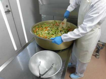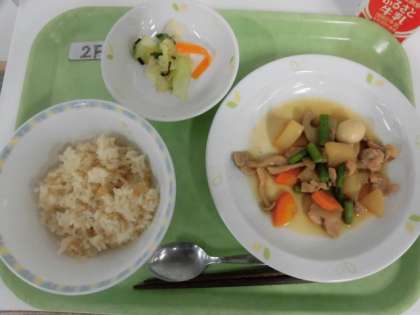今日は和食献立です。鶏肉と根菜の煮物には手作りだしを使っています。キャベツの浅漬けの味付けは塩こんぶのみです。塩分だけではなくうま味がある塩こんぶを使い、薄味でもおいしいあえものができました。