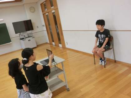 6年生が、4月に着任した教職員を紹介するビデオ制作をしていました。まもなく完成です。オープニングの場面を撮影していた6年生。真剣です。3人のチームワークも抜群です。編集も自分たちで行い、撮影・編集したビデオを使って全校の子供たちに伝えていく予定です。