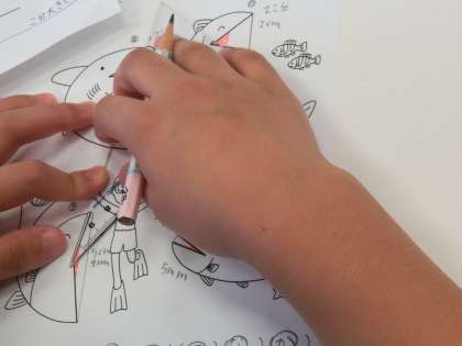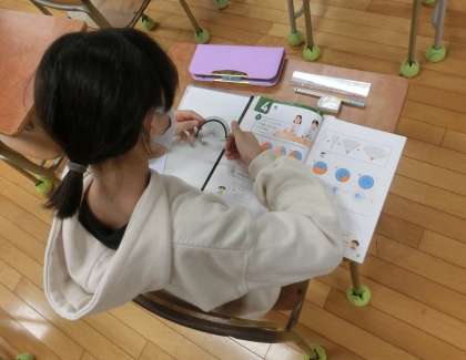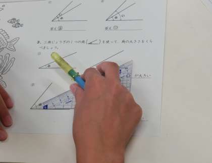 角の大きさを比べるために、三角定規を使って確かめました。このような活動を数学的活動と言い、学びを深めるためにはとても大切な活動になります。三角形の角のいくつ分かを調べる子供たち。とても真剣な態度に感心しました。分度器があることの利便性や仕組みについての考えを深めていきました。