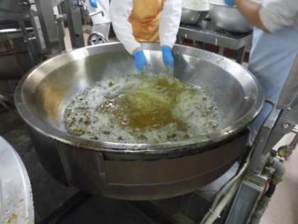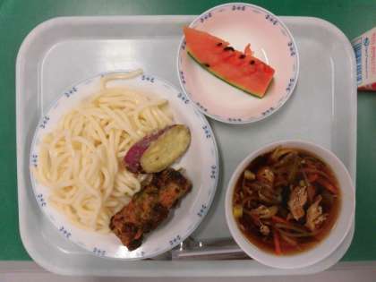 今日は五目冷やしうどん・天ぷら・すいかと、夏らしい和食献立です。天ぷらはさつま芋とちくわ(卵無し)の2種類です。ちくわの天ぷらには衣に青のりを少し混ぜて、揚げ釜にちくわを1個ずつ入れて揚げました。礒の香りがちくわに合う1品です。