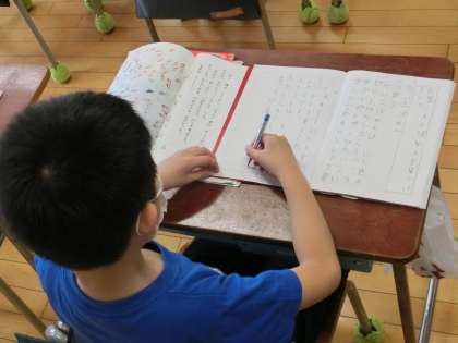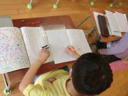 スイミーの世界を読み取った子供たち。ノートに考えをまとめます。ノートのとり方がすばらしい2年生。このクラスの目標の一つが「ていねいに!」・・・自分たちの目標を達成するためにがんばっている様子が、子供たちの学びの姿から伝わってきます。