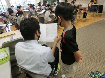 1学期最後の日に各担任から子供たちへ「あゆみ」を渡しました。今学期の「あゆみ」はいつもと異なり、所見のみですが、子供たちのがんばりについて心を込めて書きました。担任からのメッセージです。一人一人に時間をかけて、「あゆみ」を渡す担任。1学期のがんばりを伝えていました。うなずきながら聞く子供たち。自分のがんばりを先生に伝えている子もいました。