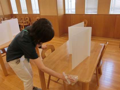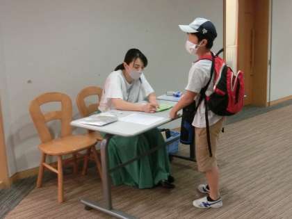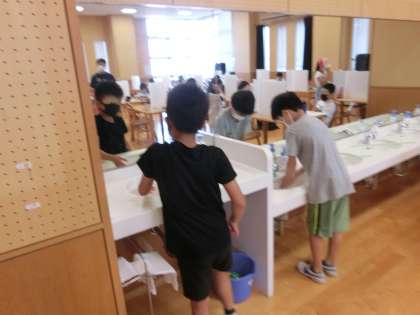 夏の「つなぐ」教室、「自主的な学びコース」の様子を紹介します。このコースは、自ら進める学習の場です。「自分で決めた学習を進める」「自分で目標を設定し学びを深める」「調べ学習に挑戦する」など、子供たちの主体的な学び(自学学習)の場を設定します。自分で決めた学びを、自分で計画し、最後までやり遂げる力を育む機会とするとともに、自学学習の習慣化をめざします。学習のための教材等も自分たちで用意します。受付で「健康チェック表」を確認し、手洗いをしっかりした後、学習がスタートします。パーテーションで区切った空間で子供たちは集中して学びを進めます。子供たちが学習を終えた後は、その都度消毒を行います。