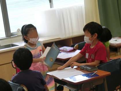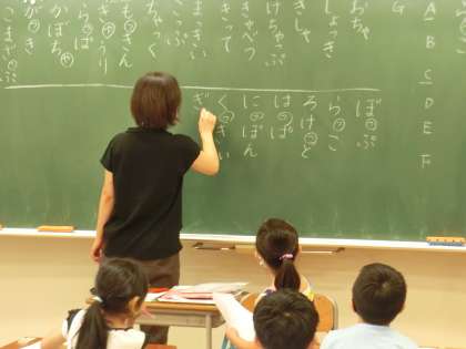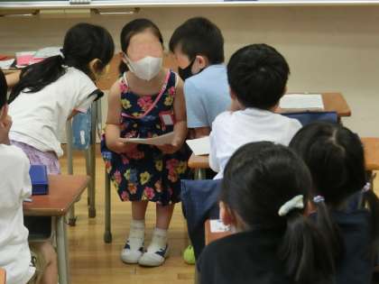 8月4日・・・夏の「つなぐ」教室、第2日目を迎えました。今日も朝からたくさんの子供たちがこの教室に参加しました。写真は1年生の国語の授業の様子です。促音・拗音についての復習です。言葉集めをしたのち、グループごとに発表しました。どの言葉を発表するかはグループで相談します。楽しい学習になりました。