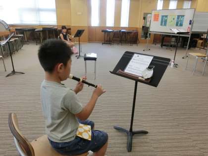 音楽室ではリコーダーの学習を行っています。対象は3年生。一人前半1回と後半1回の合わせて2回参加できるシステムです。感染予防対策をしっかり行うため、1回につき二人の子供たちが参加しています。子供たちもおうちでたくさん練習したのでしょうか、音がとてもきれいです。後半では、友達の音をしっかり聞き、互いのよさを感じ取る時間をつくりました。「タンギングがとてもきれいです。」「リズムがしっかりしています。」など、感想を述べ合いました。15分の最後は先生のピアノと子供たち二人の音を互いに聞きながら吹きました。距離は離れていても心は同じ方向を向いていました。