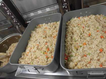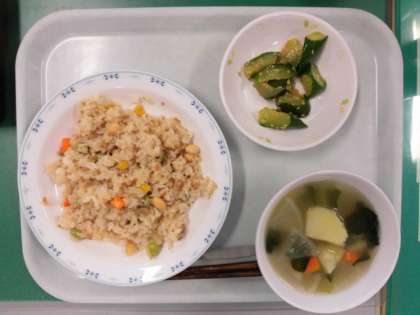 今日は大豆入りのチャーハンです。大豆は畑の肉と呼ばれるほどたんぱく質が多くふくまれる食べ物です。今日は枝豆もいっしょに加えて、白・緑・黄色・赤などの色も楽しめる1品になりました。