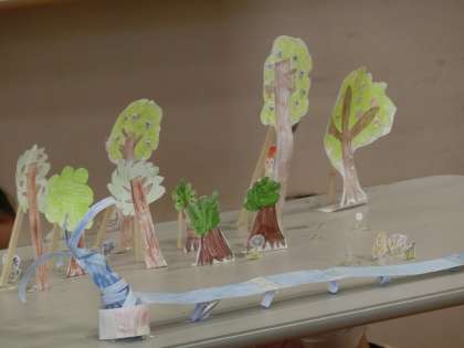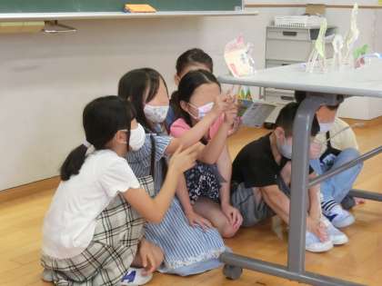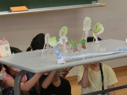 2年生の係活動の様子です。実は、1学期の終わりごろ、「赤ずきん」の人形劇をクラスの友達に見せるために、係の仲間と練習と準備をしていることを2年生から聞いていました。招待状もいただいていました。子供たちは、最後の準備を夏休み中も続け、9月1日に発表の場が設けられたのです。招待状をもってクラスを訪問すると、チケットにスタンプを押してくれました。いよいよ人形劇のはじまりです。練習の成果が発揮されました。