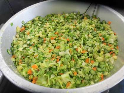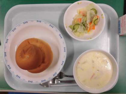 今日はパン献立です。グリーンサラダには少し酢を多めに加えたドレッシングをつくり混ぜました。少し強い酸味がアクセントになり、食欲を増進させています。